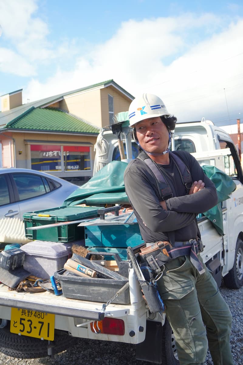 私が乗っているのは、ダンプ機能の付いた軽トラ。「会社に一台あったら便利じゃないですか?」って社長に言ったら、この車になりました(笑)