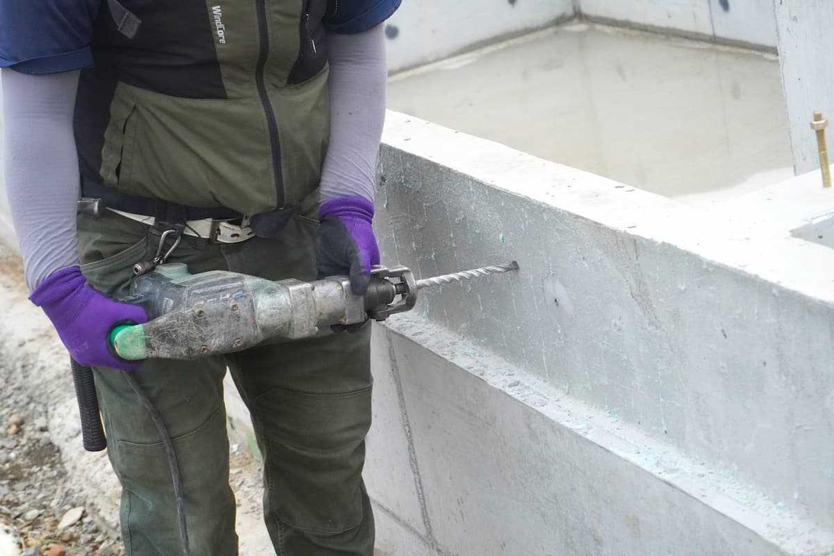 硬いコンクリートを削り砕きながら穴をあける工具。型枠を固定する金具を取り付けるため、正確な位置に下穴をあけます。