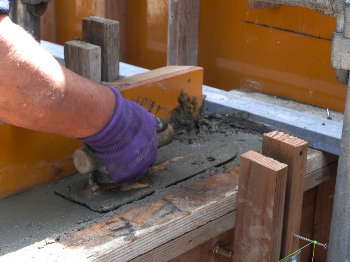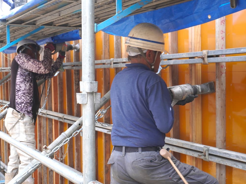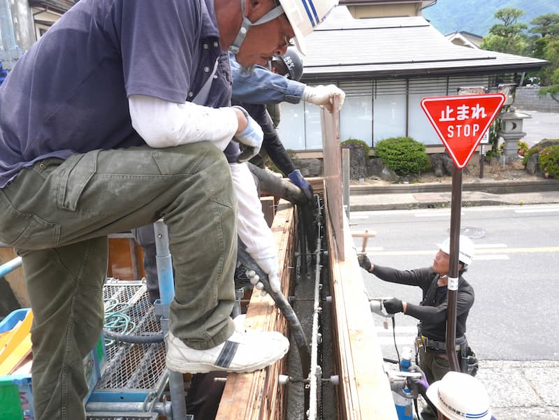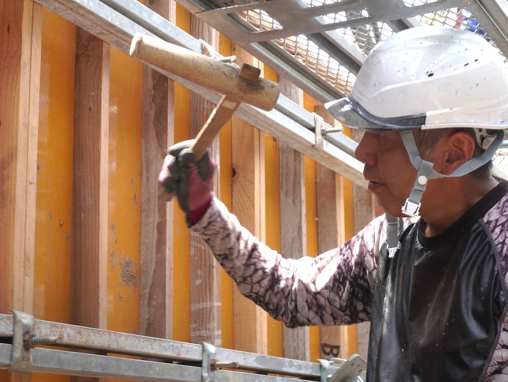 コンクリートを流し込んだ後、型枠の外側を木槌で叩いて振動を与えます。内部の空気を抜き、コンクリートを隅々まで生き渡らせることで、強度と見た目を均一に仕上げます。