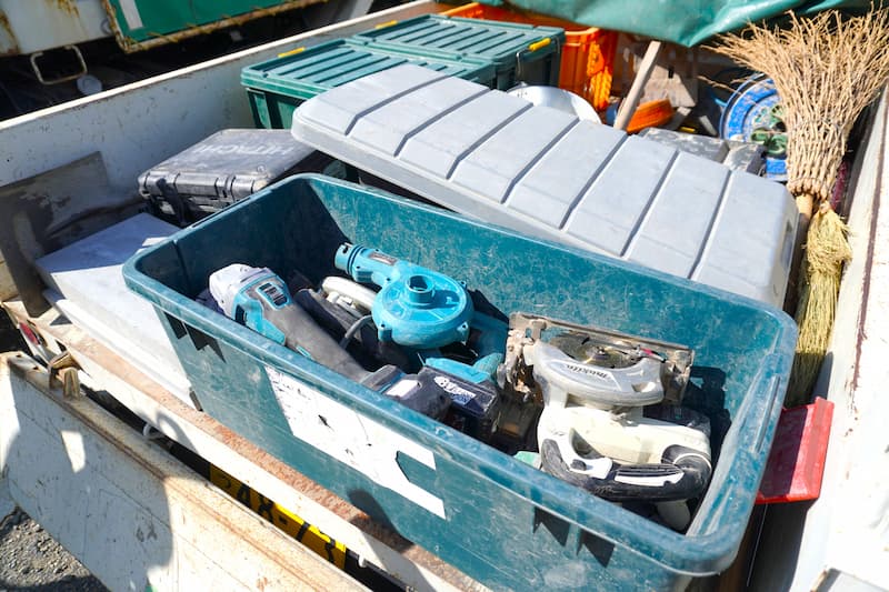 雨で濡れないように、電動工具や釘、スプレー類はすべて箱に収納。用途ごとに箱を分けているので、どこに何があるかは一目瞭然です。