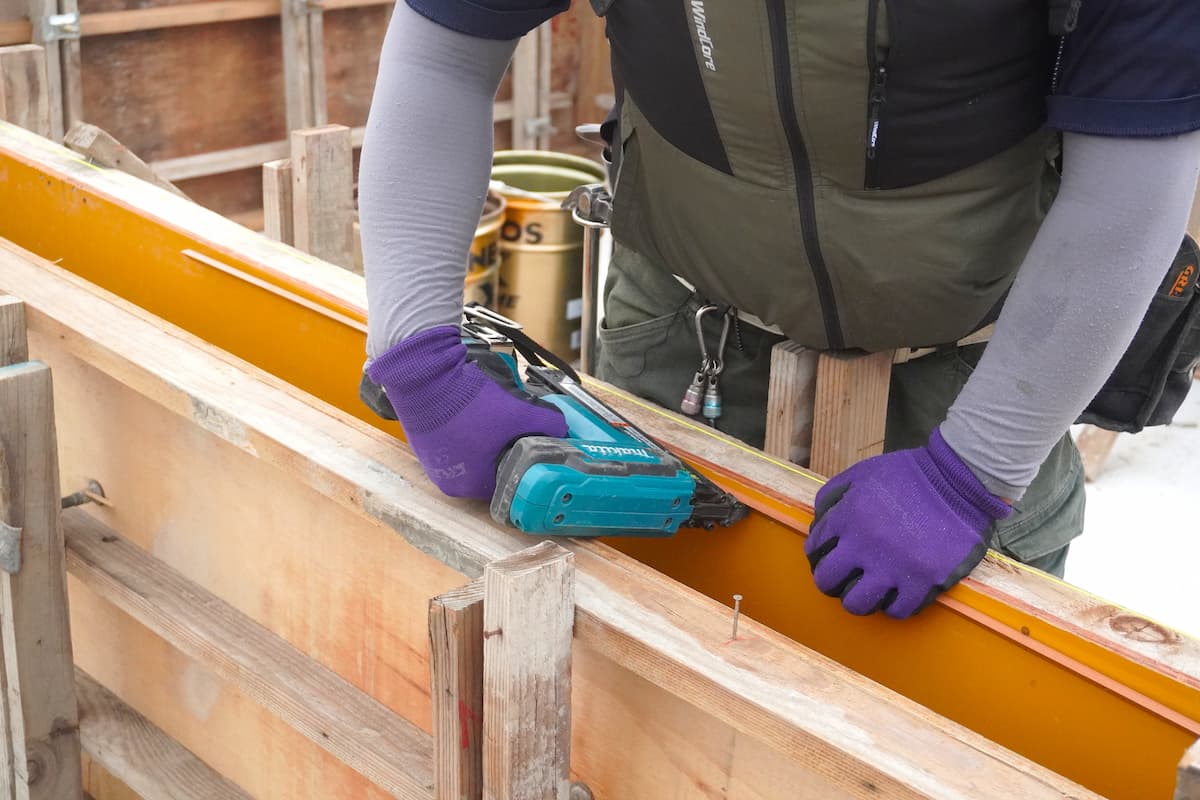 トリガーを引くと、先端から釘が勢いよく飛び出します。コンクリートの角を整える面木や、型枠パネルをしっかり固定。取り付け場所の仮止めや、型枠の仕上げ作業にも役立ちます。