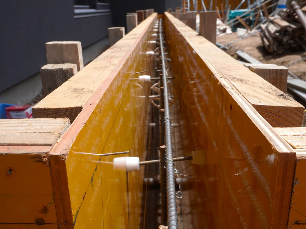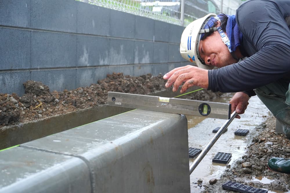 型枠や建物を支える金具をまっすぐ設置するため、水平器で角度や高さを確認しながら作業を進めます。傾きやズレを防ぎ、土台を正しくつくるのに役立ちます。