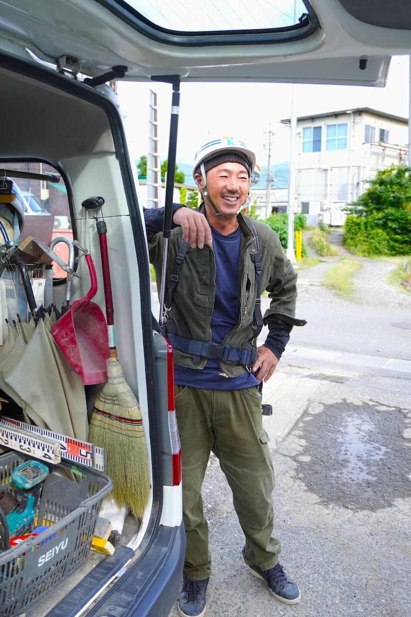 よく使う道具は、すぐに手が届く場所に。軽トラの荷台には、作業の流れを計算して道具を配置しています。
