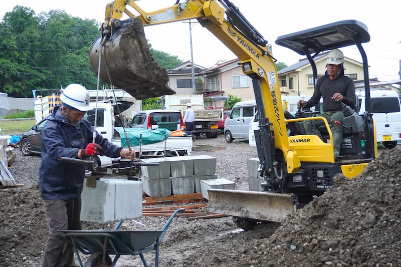 たとえば、重機を操縦している人がブロックの向きを変えておいたり、ブロックを降ろす人が一輪車の通り道を整えておいたり。