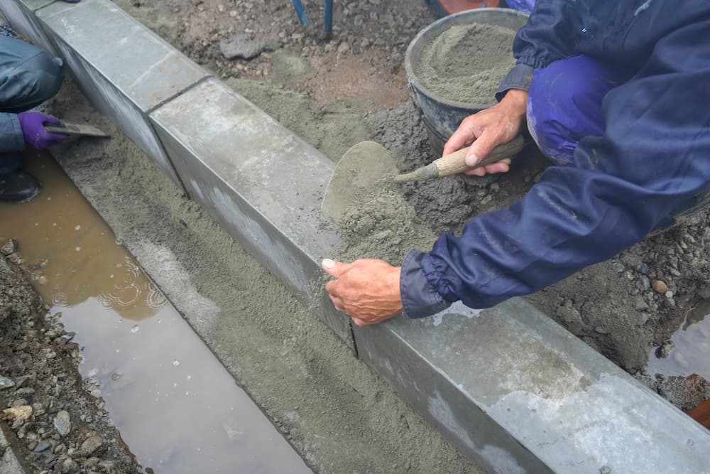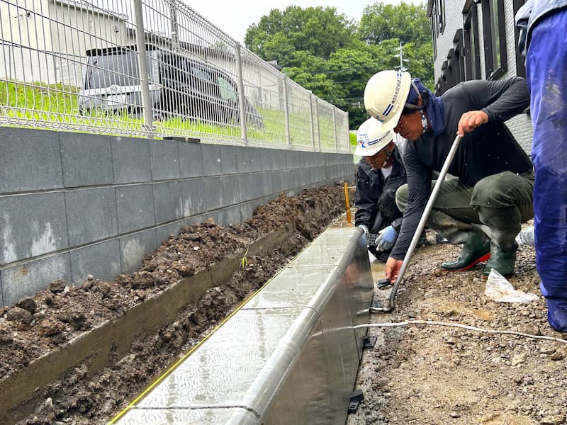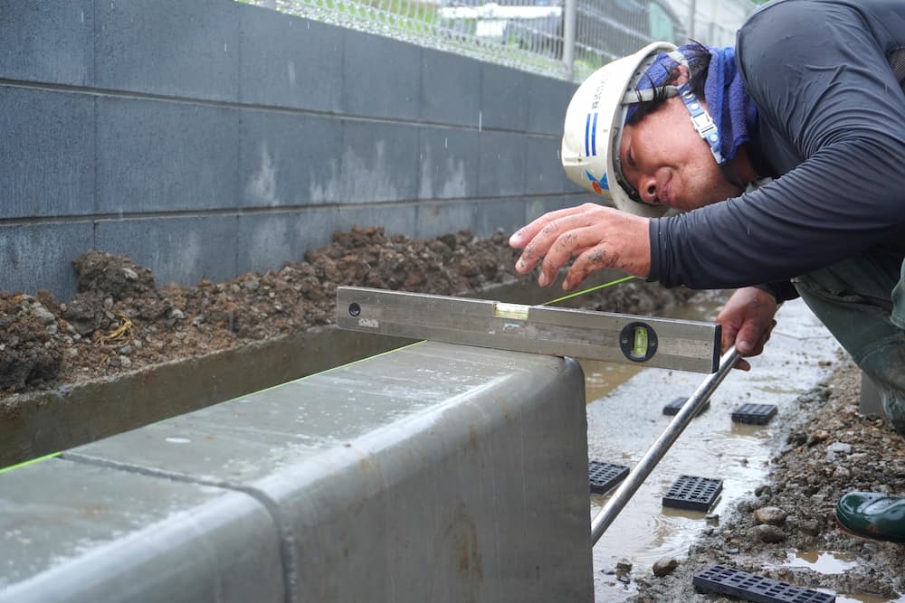 今日の主役は、高さ30cm×幅15cm、重さ80kgのブロック。重機で吊る人、一輪車で運ぶ人、受け取って設置する人――役割は違っても、目標は同じ。「まっすぐ、キレイに、速く」仕上げること。