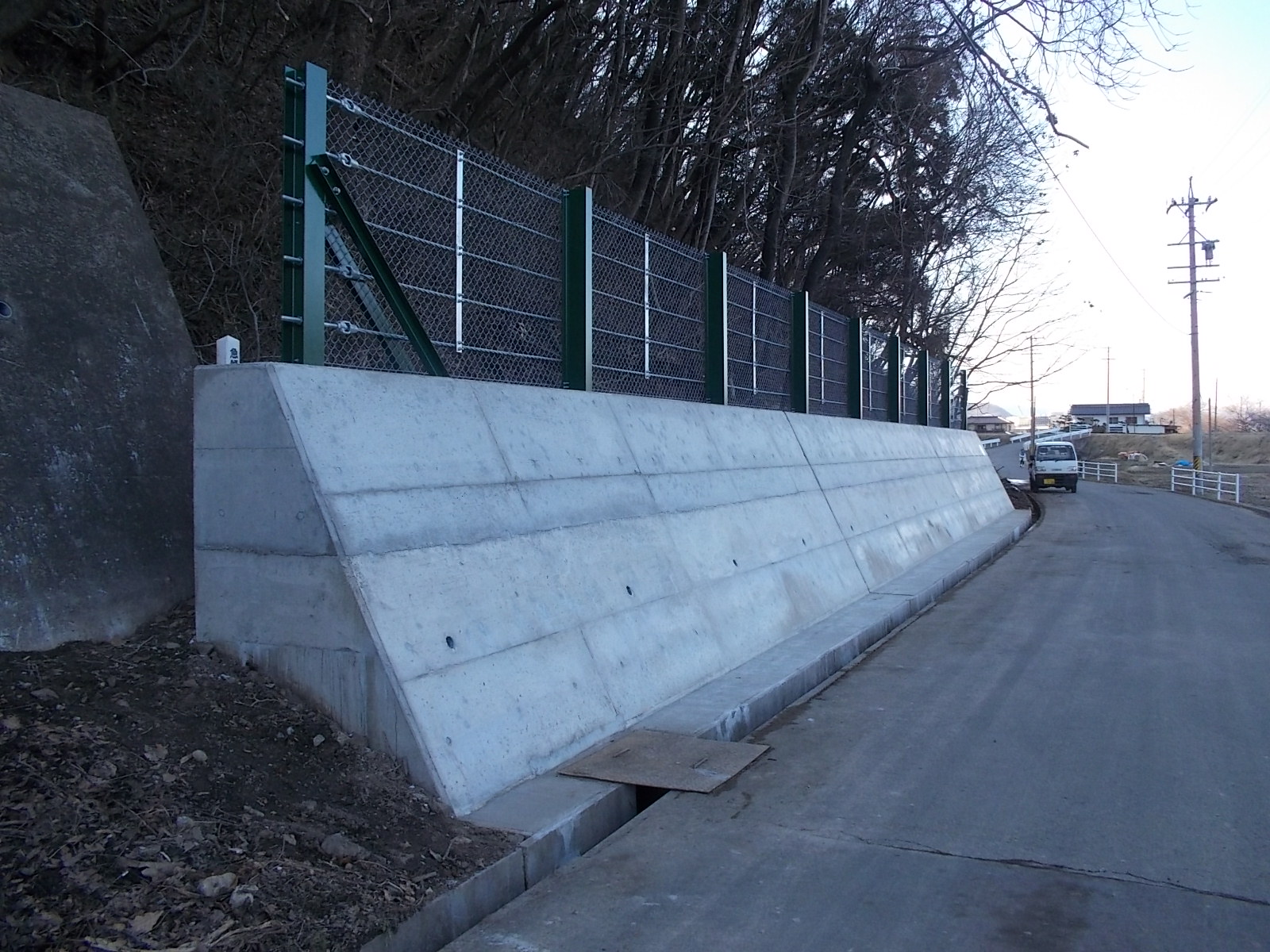 坂城町網掛地区の急傾斜地に、重力式擁壁と落石防止フェンスを建設しました。